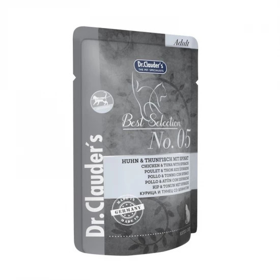 Összetétel: 66,2% csirkéből (csirkeszív, csirkehús, csirkemáj, csirkegyomor, csirkenyak), 30,6% tonhal, 2% spenót, 1% ásványi anyagok, 0,2% lenolaj, 0,1% macskagamandor. Analitikai összetevők: nyersfehérje 10,2%, nyerszsír 5,5%, nyershamu 2,5%, nyersrost 0,4%, nedvességtartalom 80%.