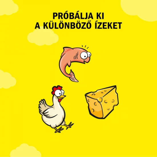 Összetétel: hús- és állati származékok, gabonafélék, olajok és zsírok, növényi eredetű származékok, növényi fehérjekivonatok, halak és halszármazékok (beleértve a narancssárga darabokat tartalmazó 4% lazacot és a barna darabokban 4% tonhaltartalmat), ásványi anyagok.