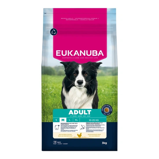 Az Eukanuba friss csirkehúsban gazdag tápszemes szárazeledele tökéletes választás a közepes testű, 1-7 éves felnőtt kutyák számára. Az Eukanuba szárazeledelben lévő L-karnitin elősegíti a testzsír csökkentését és a kutya optimális testsúlyának fenntartását, ami kíméli az ízületeket. A prebiotikumokból és cukorrépapépből álló igényre szabott rostkeverék segíti az állat egészséges emésztését. Az Eukanuba tápszemek a bennük lévő természetes omega-6 és omega-3 forrásoknak köszönhetően hozzájárulnak az egészséges bőr és a fényes szőrzet megőrzéséhez is. Az eledelben lévő antioxidáns E- és C-vitamin pedig a kutyák immunrendszerét erősíti. Ráadásul az egyedülálló Eukanuba hatszögletű tápszem a DentaDefense fogápolási technológiával együtt hosszú távon az állat fogainak tisztaságát és egészségét is támogatja. A 100%-ban teljes és kiegyensúlyozott eledel korszerű táplálkozást biztosít a közepes testű kutyák számára, támogatva az optimális testalkatot és az élethosszig tartó jóllétet.