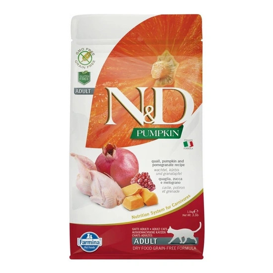 Fürj, sütőtök, gránátalma. Teljes értékű eledel felnőtt macskák részére.