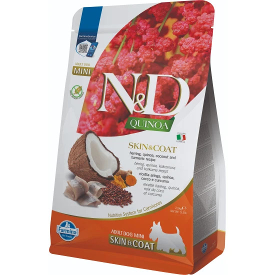 N D Quinoa Skin Coat egy teljes értékű diétás eledel felnőtt kutyák számára, valamely összetevővel vagy tápanyaggal szembeni érzékenység csökkentésére.