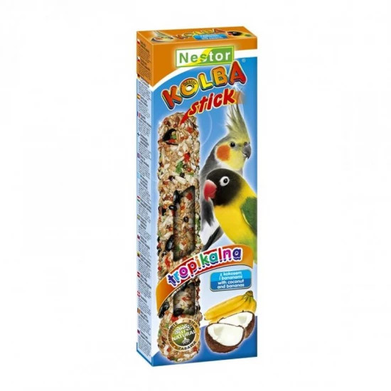 Gabonakeverékkel bevont Nestor eledel pálcika Duplarúd nagypapagájoknak trópusi gyümölccsel. Élmény a magok kicsipegetésében.