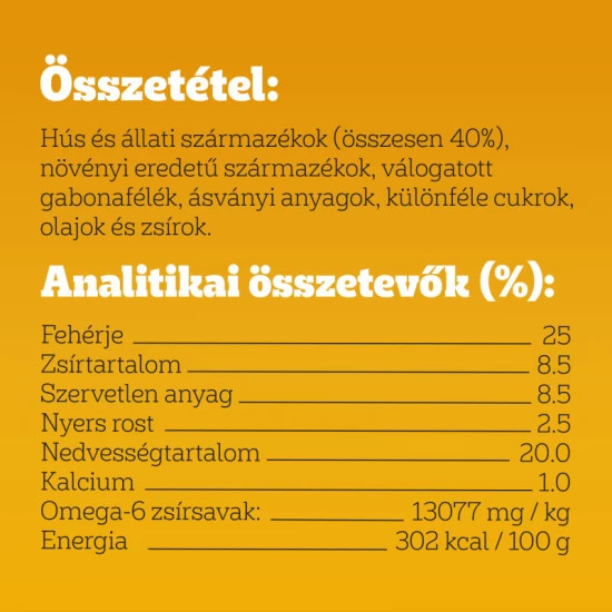 Összetevők: Hús és állati származékok (összesen 40%), Növényi eredetű származékok, Válogatott gabonafélék, Ásványi anyagok, Különféle cukrok, Olajok és zsírok