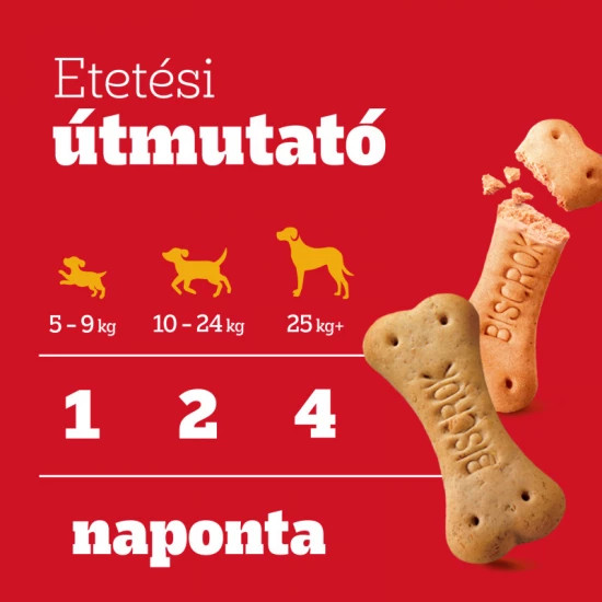 Kistestű kutyáknak (pl. tacskó) max. 1 keksz naponta. Közepes testű kutyáknak, pl. spániel max. 2 keksz naponta. Nagytestű kutyáknak kutyáknak, pl. labrador max. 4 keksz naponta. A napi etetési mennyiség kialakításakor kérjük vegye figyelembe a jutalomfalat mennyiségét is. Ne feledkezzen meg friss ivóvizet biztosítani kedvence számára.