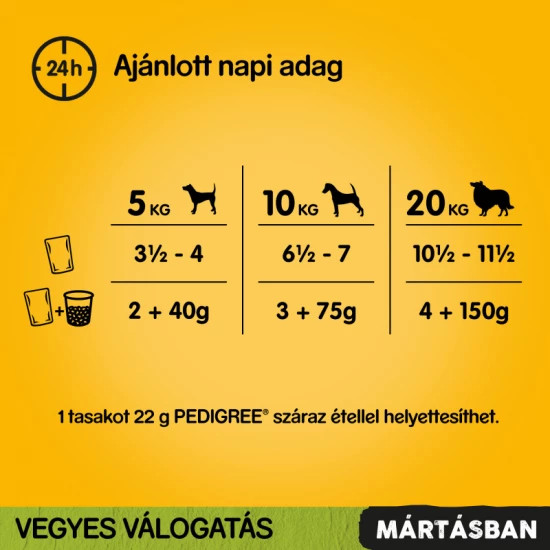 A Pedigree alutasakos eledeleket állatorvosokkal és táplálkozási szakértőkkel együttműködve fejlesztik ki a Waltham kisállat táplálkozási Központban, azért, hogy a kisállatok hozzájussanak minden szükséges tápanyaghoz, segítve a megfelelő emésztésüket, az egészséges bőr és szőrzet kialakulását, a szervezet természetes védekezőképességét és az egészséges csontozat fejlődését. A Pedigree alutasakos kutyaeledelek nem tartalmaznak mesterséges színezéket, ízfokozót vagy tartósítószert. A Pedigree meggyőződése, hogy a kutya pozitív hatással van ránk. Az ártatlanságuk a legjobbat hozza ki belőlünk minden nap. Az ízletes és egészséges Pedigree eledelek és jutalomfalatok széles választéka biztosítja a szükséges tápanyagokat, erősíti a kutyákkat, megvédi és elősegíti az életszeretetük kialakulását is. Ennek köszönhetően a gazdik segítenek kialakítani a megfelelő szokásokat minden nap. Az ízletes, teljes értékű és kiegyensúlyozott eledelek széles választéka tartalmaz mindent, amire a kutyáknak szükségük van a megfelelő fejlődéshez. Az eledelek annyira finomak, hogy egyetlen kutya sem tud ellenállni nekik, és a farokcsóválás a legjobb bizonyítéka annak, hogy ön kiváló életminőséget biztosít kutyájának.