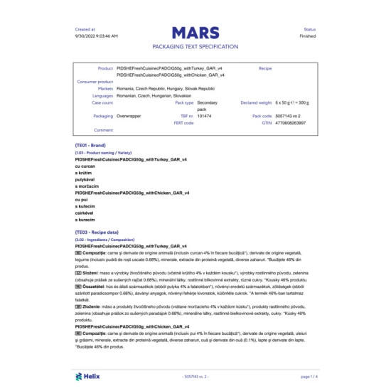 Hús és állati melléktermékek (45%, többek között 4% csirke), növényi melléktermékek, olajok és zsírok, ásványi anyagok, cukor, tojás és tojástermékek (0,096%), tej és tejtermékek.