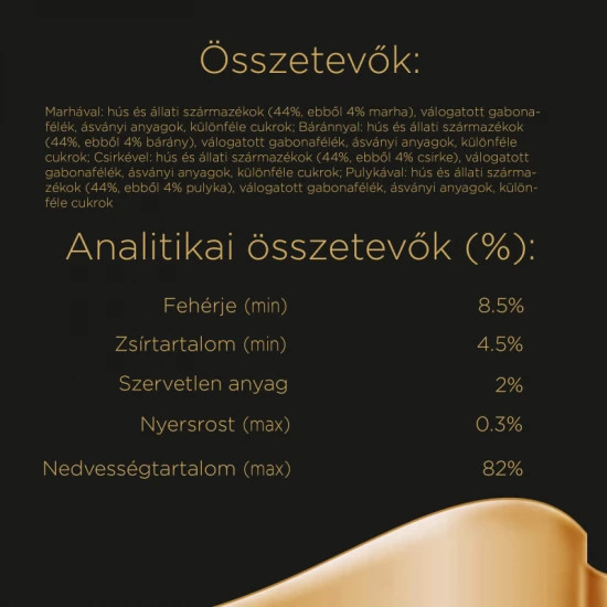 - Pulykával: hús és állati származékok (44%, ebből 4% pulyka), válogatott gabonafélék, ásványi anyagok, különféle cukrok