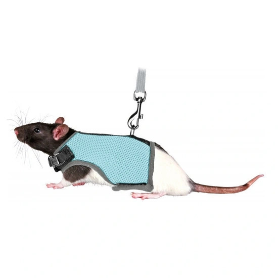 Könnyen szellőző, hálós hám és hevederszalagból készült póráz szett patkányok számára. Teljesen elasztikus póráz, karabiner csatlakozási lehetőséggel. A mellkas és has tépőzárral fokozatmentesen állítható.