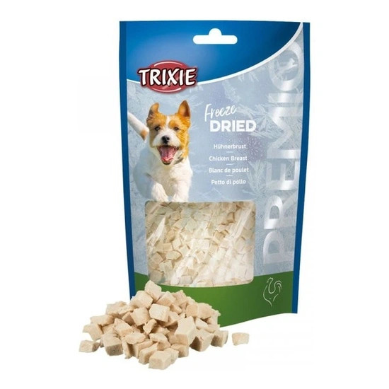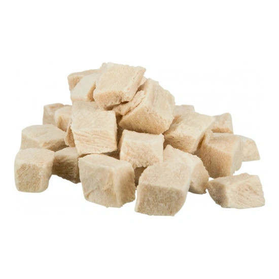 Összetétel: Fagyasztva szárított csirkemell (99%), tápióka keményítő. Gluténmentes, hozzáadott cukor nélkül.