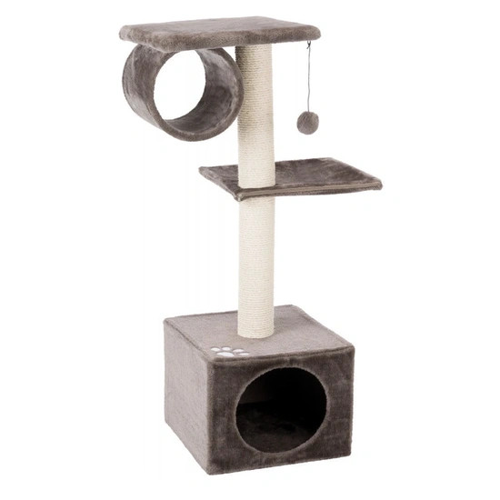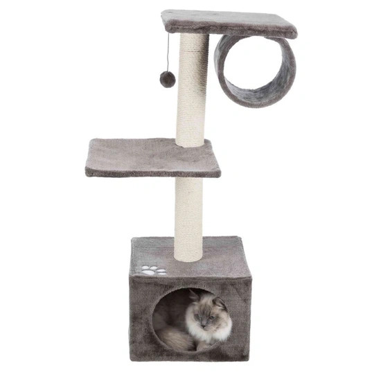 Trixie - Kaparófa San Fernando szürke 106 cm A macskáknak koptatniuk kell a karmaikat nehogy azok elakadjanak és ezáltal komolyabb sérülések történjenek. A kaparófa megfelelő helyet biztosít a cica számára a karmok koptatására anélkül hogy a bútorokban vagy a szőnyegben kárt tenne. Fiatal és senior macskák részére egyaránt alkalmas. 2 fekvőhelyből (1 kagyló alakú) 2 oszlopból 1 hengerből és 1 odúból áll.