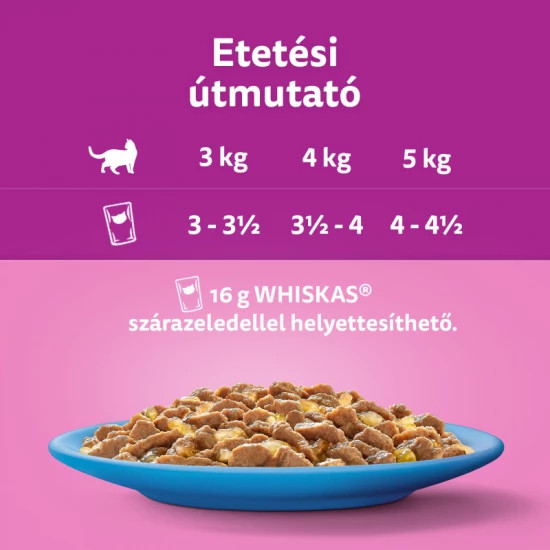 Etetési útmutató A napi szükséglet 3 kg-os macska esetén 3 - 31 tasak, 4 kg-os macska esetén 31 - 4 tasak, 5 kg-os macska esetén 4 - 41 tasak. 1 tasak 16 g WHISKAS® szárazeledellel helyettesíthető. Számolja a jutalomfalatokból származó kalóriát. Az etetési mennyiség kialakításakor vegye figyelembe macskája igényét. Hogyan? Látogasson el weboldalunkra. Kínáljon hozzá friss vizet. Szobahőmérsékleten tálalva a legfinomabb, felbontástól számítva 2 napig hűtve eltartható.